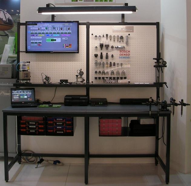 Postazione da lavoro per la revisione di componenti di precisione degli apparati di iniezione diesel.